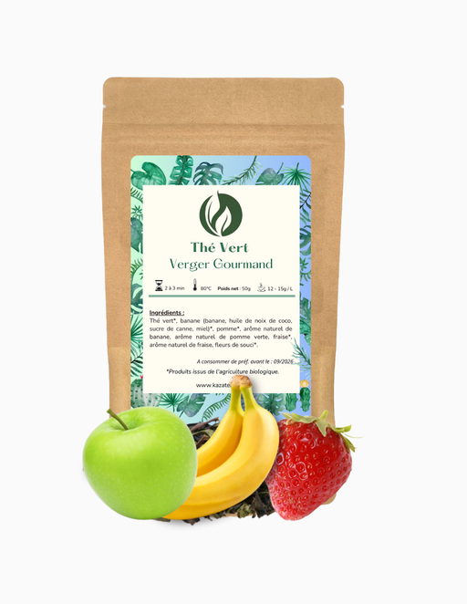 Afficher tous les détailsThé Verger Gourmand, Banane, Pomme, Fraise, est un thé vert fruité et gourmand, parfait pour les amateurs de saveurs fraîches et naturelles. Ce mél...