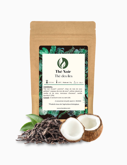 Afficher tous les détailsThé des îles - vanille coco est une création exotique et gourmande qui marie les arômes profonds du thé noir avec la douceur crémeuse de la vanille...